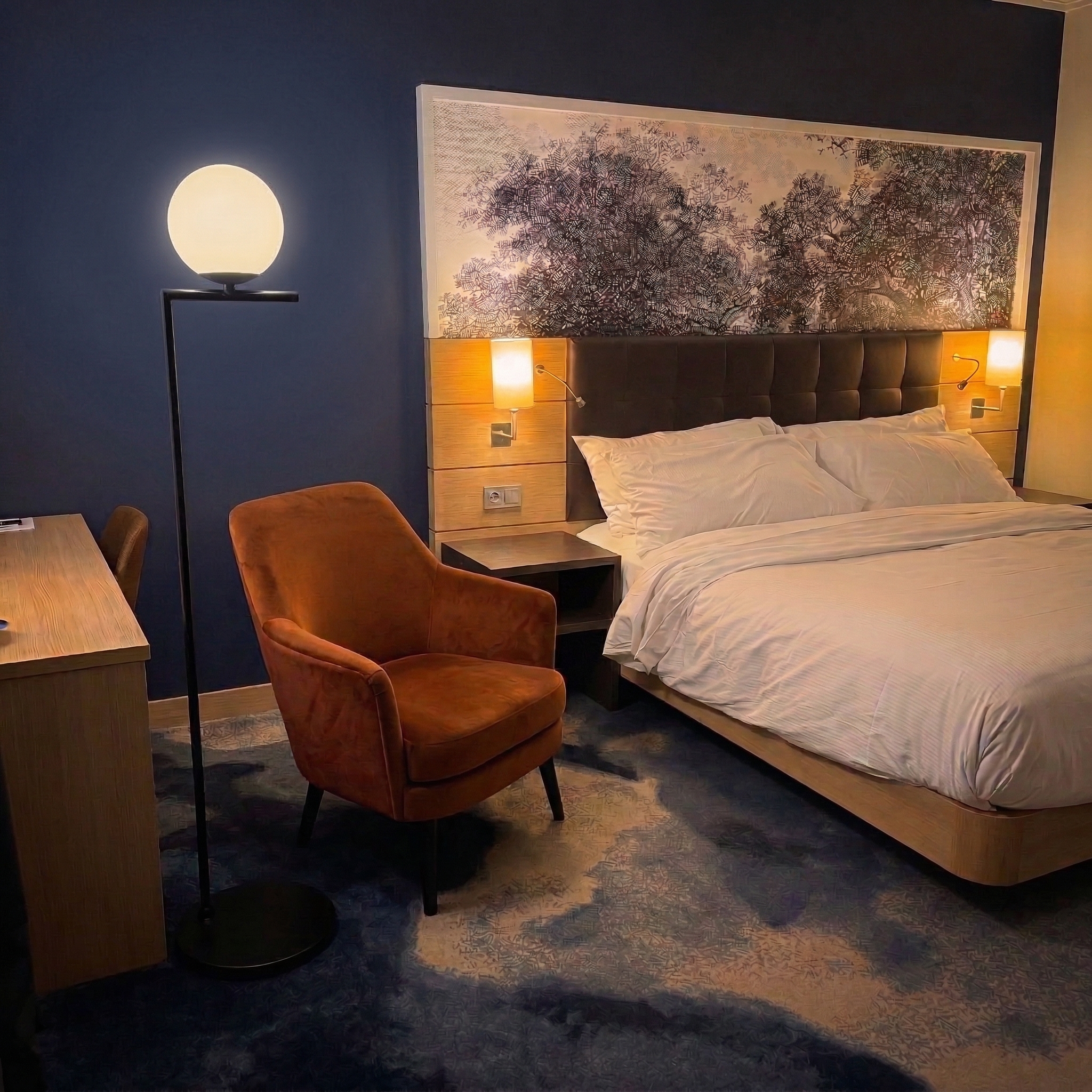 Die Stehleuchte S 8177 reduziert Form auf das Wesentliche: ein schlanker, vertikaler Stab aus matt-schwarzem Metall trägt einen asymmetrischen Querbalken, auf dem eine satinierte Opalglas-Kugel ruht. Die geometrische Klarheit des Gestells — Vertikale, Horizontale, Kreis — erzeugt eine skulpturale Spannung, die an Bauhaus-Proportionen erinnert, ohne nostalgisch zu wirken. Im beleuchteten Zustand strahlt die Kugel ein gleichmäßiges, weiches Warmweiß in alle Richtungen ab und hüllt den umgebenden Raum in einen sanften Lichtnebel. Die runde Bodenplatte gibt der Leuchte einen stabilen, unauffälligen Stand. Ob als Leseleuchte neben dem Sessel im Hotelzimmer, als Akzent in der Suite oder als raumbildendes Lichtelement im Wohnbereich — die S 8177 verbindet minimale Geste mit maximaler Lichtwirkung.